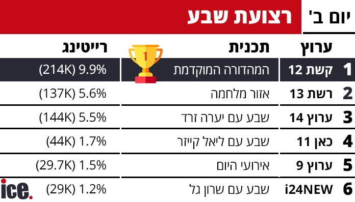 ברצועת שבע השתלטה "המהדורה המוקדמת" של קשת 12 על המקום הראשון עם 214,000 צופים ו-9.9% רייטינג. במקום השני התמקם "אזור מלחמה" של רשת 13 עם 137,000 צופים ו-5.6% רייטינג, ובמקום השלישי "שבת עם יערה זרד" של ערוץ 14 עם 144,000 צופים ו-5.5% רייטינג. "שבת עם ליאל קייזר" של כאן 11 הגיע למקום הרביעי עם 44,000 צופים ו-1.7% רייטינג, ובמקום החמישי "אירועי היום" של ערוץ 9 עם 29,700 צופים ו-1.5% רייטינג. "שבע עם שרון גל" של i24NEWS סגר את הרשימה עם 29,000 צופים ו-1.2% רייטינג.