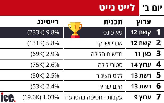 הלייט נייט הציג תמונה ברורה של עליונות ערוץ 12, כאשר גיא פינס הוביל בביטחון עם 233,000 צופים ו-9.8% רייטינג. במקום השני התמקם "אברי ושרקי" של ערוץ 12 עם 131,000 צופים ו-5.8% רייטינג, ובמקום השלישי מדורג "חדשות הלילה" של כאן 11 עם 69,000 צופים ו-2.9% רייטינג. את המקום הרביעי תפס "סטורי לילה" של ערוץ 14 עם 75,000 צופים ו-2.6% רייטינג, ובמקום החמישי "לקט הצינור" של רשת 13 עם 50,000 צופים ו-2.5% רייטינג. "היום שהיה" של רשת 13 סגר את השישייה עם 53,000 צופים ו-2.4% רייטינג, בעוד "עקבות - חטיפה בהפרעה" של ערוץ 9 הגיע ל-19,600 צופים ו-1.03% רייטינג.