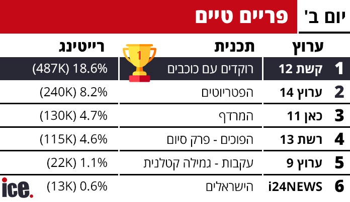 כמו בכל יום כמעט, גם אמש (שני) קשת 12 סיימה כמובילה בכל הרצועות המרכזיות, בעוד שערוץ 14 ורשת 13 נאבקים על המקום השני, וכאן 11 מחזיק במקום הרביעי ברוב הרצועות ולא מהווה איום.