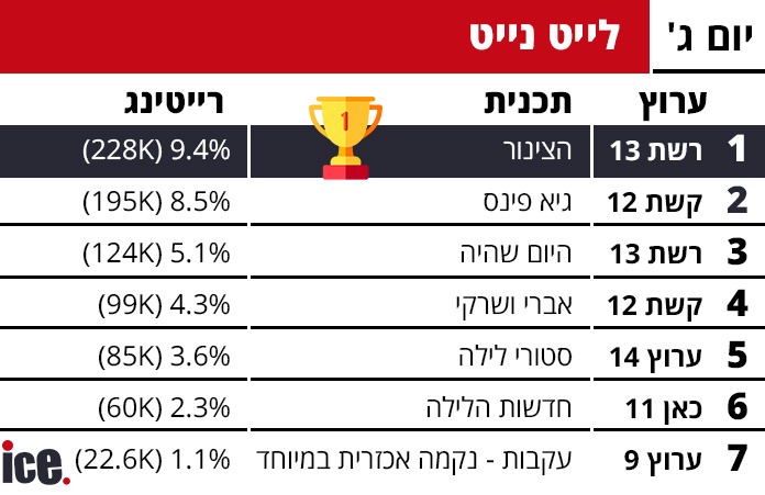 ברצועת הלילה המאוחרת הובילה הצינור ברשת 13 עם רייטינג מרשים של 9.4% ו-228 אלף צופים. במקום השני התמקמה גיא פינס עם 8.5% ו-195 אלף צופים. היום שהיה הגיע למקום השלישי עם 5.1% ו-124 אלף צופים, ואחריו אברי ושרקי בעמדה הרביעית עם 4.3% ו-99 אלף צופים. סטורי לילה סגר את החמישייה העליונה עם 3.6% ו-85 אלף צופים. חדשות הלילה השיגה 2.3% עם 60 אלף צופים במקום השישי, ובתחתית הטבלה נמצאה עקבות - נקמה אכזרית במיוחד עם 1.1% ו-22.6 אלף צופים בלבד.