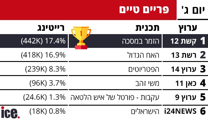 הפטריוטים בערוץ 14 הגיעו למקום השלישי עם 8.3% ו-239 אלף צופים, ומשי זהב בכאן 11 תפס את המקום הרביעי עם 3.7% ו-96 אלף צופים. עקבות בערוץ 9 זכה ל-1.3% עם 24.6 אלף צופים, והישראלים בערוץ i24news סיימו עם 0.8% ו-18 אלף צופים.