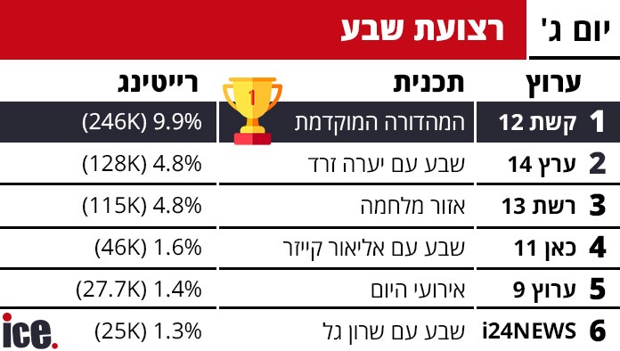 ברצועת השעה שבע השתלטה המהדורה המוקדמת בקשת 12 על הרייטינג הגבוה ביותר עם 9.9% ו-246 אלף צופים. שבע עם יערה זרד בערוץ 14 תפסה את המקום השני עם 4.8% ו-128 אלף צופים, ואזור מלחמה ברשת 13 זכתה לאותו רייטינג של 4.8% אך עם מעט פחות צופים - 115 אלף. שבע עם ליאל קייזר בכאן 11 הגיעה רביעית עם 1.6% ו-46 אלף צופים, ואירועי היום השיג 1.4% עם 27.7 אלף צופים. שבע עם שרון גל ב-i24news סיים את הרשימה עם 1.3% ו-25 אלף צופים.