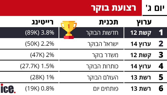 ברצועת הבוקר הובילו חדשות הבוקר בקשת 12 עם 3.8% ו-89 אלף צופים. ישראל הבוקר בערוץ 14 הגיע למקום השני עם 2.2% ו-50 אלף צופים, ומשדר בוקר בקשת 12 תפס את המקום השלישי עם 2% ו-47 אלף צופים. כותרות הבוקר בערוץ 14 השיגה 1.5% עם 27.7 אלף צופים, העולם הבוקר ברשת 13 הגיעה ל-1% עם 28 אלף צופים, ופותחים יום סיים עם 0.8% ו-19 אלף צופים.