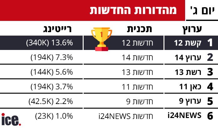 במגזר מהדורות החדשות המרכזיות הובילו חדשות 12 עם רייטינג גבוה של 13.6% ו-340 אלף צופים. חדשות 14 הגיעו למקום השני עם 7.3% ו-194 אלף צופים. חדשות 13 תפסו את המקום השלישי עם 5.6% ו-144 אלף צופים, וחדשות 11 הגיעו לעמדה הרביעית עם 3.7% ו-194 אלף צופים. חדשות 9 השיגו 2.2% עם 42.5 אלף צופים, וחדשות i24NEWS סיימו עם 1.0% ו-23 אלף צופים.