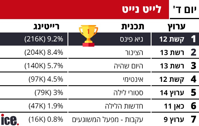 קשת 12 מובילה עם גיא פינס שרשמה 9.2% ו-216 אלף צופים. "הצינור" של רשת 13 שנייה עם 204,000 צופים (8.4%), בתחרות הדוקה מול "היום שהיה" של רשת 13 שמשכה 140,000 צופים (5.7%). "אינטימי" של קשת 12 במקום השלישי עם 97,000 צופים (4.5%), "סטורי לילה" של ערוץ 14 רשמה 79,000 צופים (3.0%), "חדשות הלילה" של כאן 11 משכה 47,000 צופים (1.9%), ו"עקבות" של ערוץ 9 סיימה עם 16,000 צופים (0.8%).