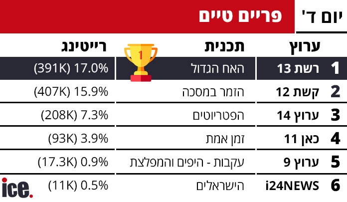 "האח הגדול" של רשת 13 מוביל עם 391,000 צופים (17.0%), אך בפער קטן מול "הזמר במסכה" של קשת 12 שמשכה 407,000 צופים (15.9%). ומה עם מהדורות החדשות?