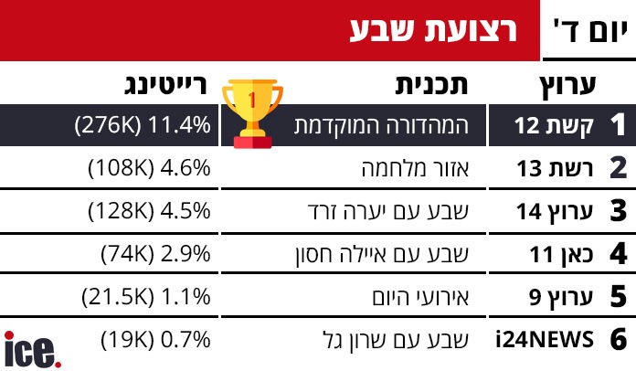 "המהדורה המוקדמת" של קשת 12 שולטת ברצועת השבע עם יתרון עצום של 276,000 צופים (11.4%), מה שמבסס את מעמדה כמהדורת החדשות המובילה בישראל. "אזור מלחמה" של רשת 13 במקום השני עם 108,000 צופים (4.6%), "שבע עם יערה זרד" של ערוץ 14 רשמה 128,000 צופים (4.5%), "שבע עם אילה חסון" של כאן 11 משכה 74,000 צופים (2.9%), "אירועי היום" של ערוץ 9 רשם 21,500 צופים (1.1%), ו"שבע עם שרון גל" של i24NEWS סיים עם 19,000 צופים (0.7%).