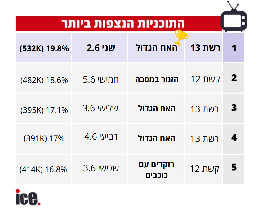 את המקום הראשון השבוע קטפה תכנית האח הגדול ששודרה ביום שני. פרק סיכומי סוף השבוע של האח גרף 19.8% רייטינג, וסחף אחריו 532 אלף צופים נלהבים. במקום השני, התייצבה באופן מרשים התכנית "הזמר במסכה" ששודרה אתמול (ה'). כשלא התחרתה יחד על המשבצת מול "האח הגדול", בזמר במסכה זכו ל-18.6% רייטינג, ו-482 אלף צופים.