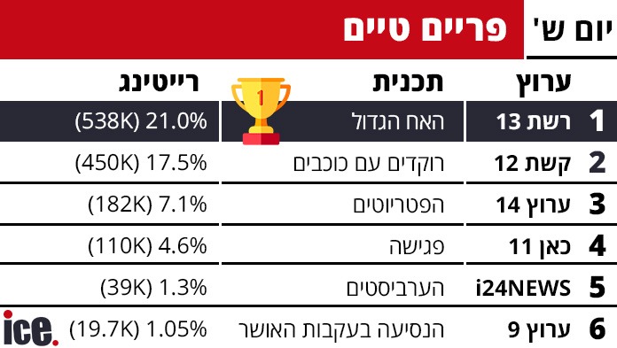 נתוני הרייטינג של אמש (שבת) מעידים על ערב מגוון בטלוויזיה הישראלית, עם הובלה ברורה של ערוץ רשת 13 בפריים טיים בזכות פרק הדחה נצפה במיוחד של האח הגדול שהגיע לפיק כמעט חסר תקדים עבור התכנית של 34.9% בשעה 23:05