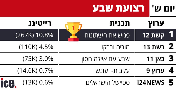 8.ומה לגבי נתוני הרייטינג של יום שישי? (ל"ת)אזרח הגון 06/2025/08הגב לתגובה זו2 0סגור