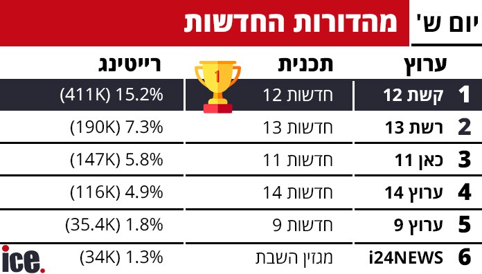 במגזר החדשות, חדשות 12 המשיכה את השליטה עם 15.2% (411 אלף צופים) ולבטח את המקום הראשון. בפער ניכר הגיעה חדשות 13 עם 7.3% (190 אלף צופים), ואחריה חדשות 11 של כאן עם 5.8% (147 אלף צופים). חדשות 14 קיבלה 4.9% (116 אלף צופים), חדשות 9 זכתה ל1.8% (35.4 אלף צופים), ובמקום האחרון מגזין הערב ב-i24NEWS עם 1.3% (34 אלף צופים).