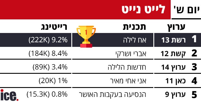 רצועת הלייט נייט נשלטה לחלוטין על ידי "אח לילה" בערוץ 13, שזכתה לרייטינג מרשים של 9.2% (222 אלף צופים), וכבשה את המקום הראשון ברצועה. בפער ניכר מאחוריה הגיע "אברי ושרקי" בערוץ 12 עם 8.4% (184 אלף צופים), ואחריו "חדשות הלילה" בערוץ 14 שזכה ל3.4% (89 אלף צופים). "אני אתי מאיר" בכאן 11 קיבל 1% (20 אלף צופים), ובמקום האחרון "הנסיעה בעקבות האושר" בערוץ 9 עם 0.8% (15.3 אלף צופים).