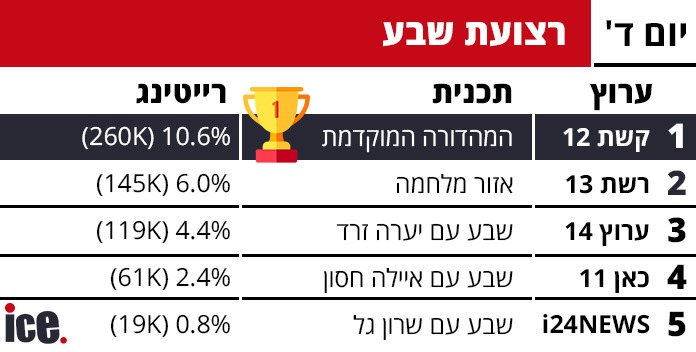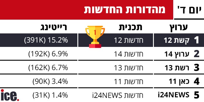 בקרב על תשומת הלב הציבורית, "חדשות 12" בקשת 12 מובילה ברייטינג של 15.2% ו-391 אלף צופים, מה שמבסס את מעמדה כמהדורה המובילה. "חדשות 14" מקבלת 6.9% ו-192 אלף צופים, בעוד "חדשות 13" זוכה ל-6.7% ו-162 אלף צופים. "חדשות 11" מבטיחה לעצמה 3.4% ו-90 אלף צופים, ו"חדשות i24NEWS" מסיימת עם 1.4% ו-31 אלף צופים.