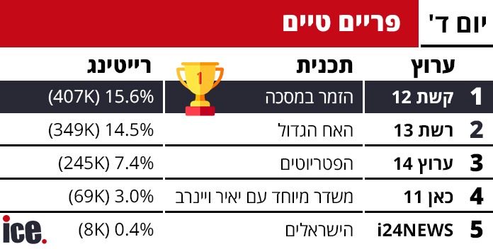 אחרי שליטה מוחלטת בימים האחרונים, קשת 12 מנשלת את האח הגדול מפסגת טבלת הרייטינג של הערוצים המרכזיים בישראל. הזמר במסכה חוזרת להוביל והשתיים משתלטות על המסך כשהפטריוטים לא מוצאים תשובה.
