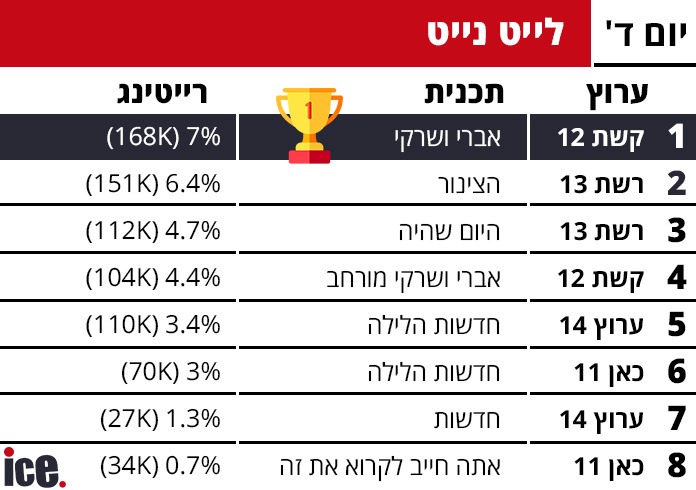 בלייט נייט, "אברי ושרקי" בקשת 12 שולטים בבלעדיות עם רייטינג של 7% המתרגם ל-168 אלף צופים, מה שמבסס את מעמדם כמלכי הלילה הבלתי מעורערים. רחוק מאחוריהם, ברשת 13 "הצינור" מוכיח יציבות עם 6.4% ו-151 אלף צופים, בעוד "היום שהיה" ברשת 13 מסתפק בנתח מכובד של 4.7% ו-112 אלף צופים.