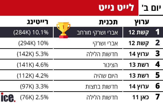 ברצועת הבידור הלילית נרשמה תחרות צמודה בין שתי תכניות של ערוץ 12. "אברי ושרקי מורחב" הובילו בשוליים עם רייטינג של 10.1% ו-284 אלף צופים, ומיד אחריהם "אברי ושרקי" עם 10% ו-294 אלף צופים. ערוץ 14 תפס את המקום השלישי עם "חדשות הלילה" (5.3%, 142 אלף צופים), ואחריו רשת 13 עם "הצינור" (4.6%, 141 אלף צופים) ו"היום שהיה" (4.2%, 112 אלף צופים). ערוץ 14 המשיך עם "חדשות בחצות" (3.3%, 97 אלף צופים), ו-i24NEWS סיים עם "חדשות הלילה" של כאן 11 (2.5%, 76 אלף צופים).