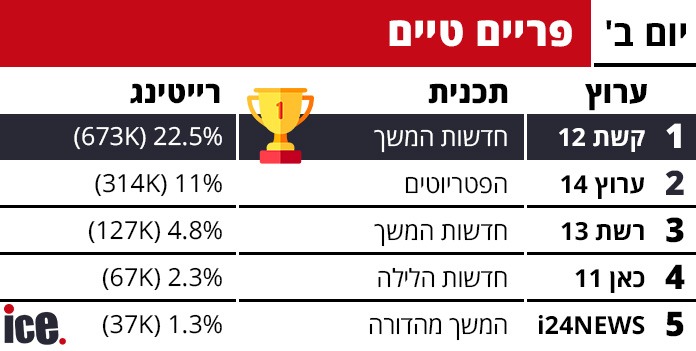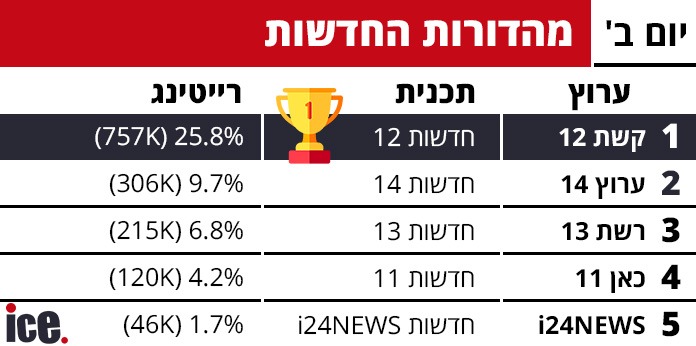 ערוץ קשת 12 רשם הישג מרשים עם דומיננטיות ברורה ברוב רצועות השידור. בפריים טיים, "חדשות ההמשך" של הערוץ זכתה לרייטינג חד של 22.5% עם 673 אלף צופים, יתרון ניכר על המתחרות. ערוץ 14 הגיע במקום השני עם "הפטריוטים" שזכו לרייטינג של 11% ו-314 אלף צופים, בעוד שרשת 13 תפסה את המקום השלישי עם "חדשות המשך" שלה ברייטינג של 4.8% ו-127 אלף צופים. כאן 11 הסתפק במקום הרביעי עם "חדשות הלילה" (2.3%, 67 אלף צופים), ו-i24NEWS סגר את הרשימה עם "המסך החדשות" (1.3%, 37 אלף צופים).