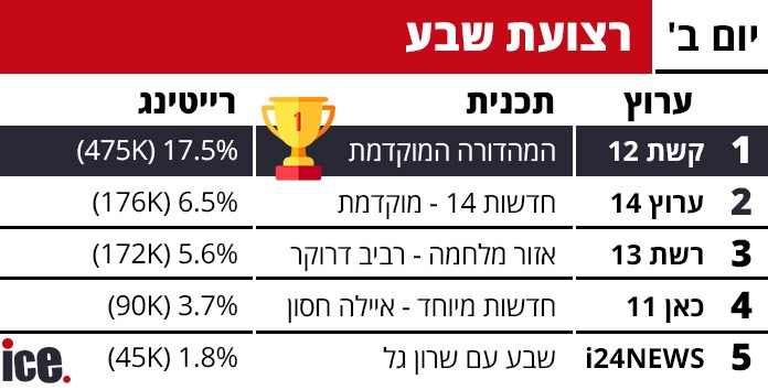 גם נתוני הרייטינג מאמש (שני) משקפים דפוס יציב של הובלה ברורה מצד ערוץ קשת 12 ברוב רצועות השידור, עם שמירה על מקומות יציבים של ערוץ 14 ורשת 13 במקומות השני והשלישי, בעוד כאן 11 ו-i24NEWS לא באותה הליגה.