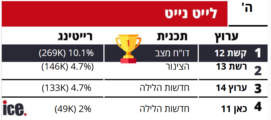 במקום הראשון ברצועת הלייט נייט, מככבת קשת 12 עם התוכנית 'דו"ח מצב'. התוכנית השיגה 10.1% רייטינג ו-269 אלף צופים. אחריה, מופיעה רשת 13 עם תוכנית הטלוויזיה "הצינור" בהגשת גיא לרר. על פי הנתונים, התוכנית גרפה 4.7% רייטינג ו-146 אלף צופים. אחריה, ניצב ערוץ 14 עם מהדורת חדשות הלילה שהשיגה 4.7% ו-133 אלף צופים. ערוץ כאן 11 השיג 2.7% ו-62 אלף צופים במהדורת חדשות הלילה המורחב.