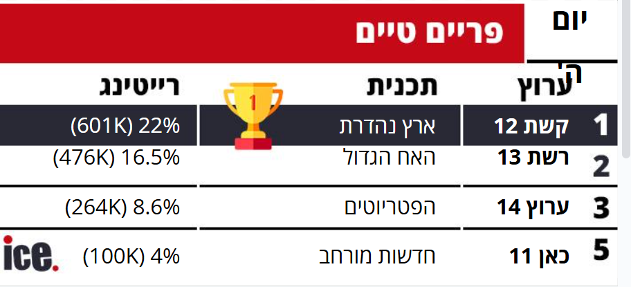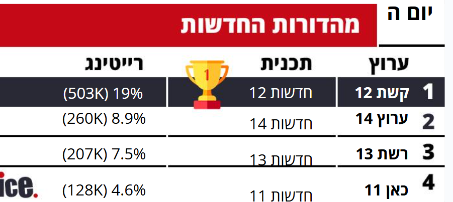 רייטינג: קשת 12 חוגגת הישג ענק, מה קרה לתוכנית "פטריוטים"?