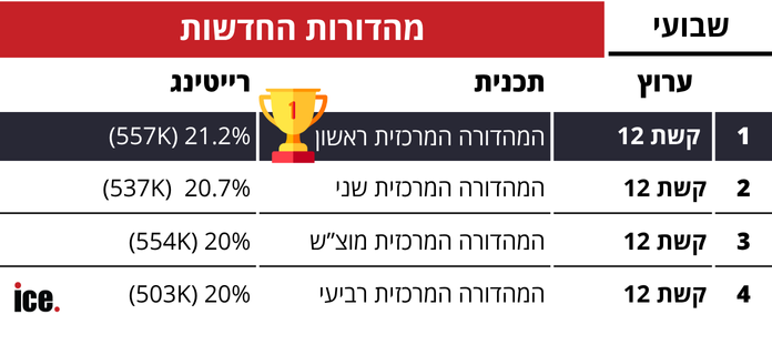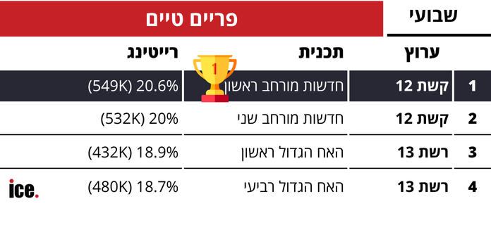 דירוג הרייטינג השבועי מציג שליטה מתמשכת של חדשות 12 מול המתחרות מ-14, 13 ו-11, כשרק 'האח הגדול' מספקים קצת בריחה מהמציאות; ואיך הלך השבוע ל'פטריוטים'?