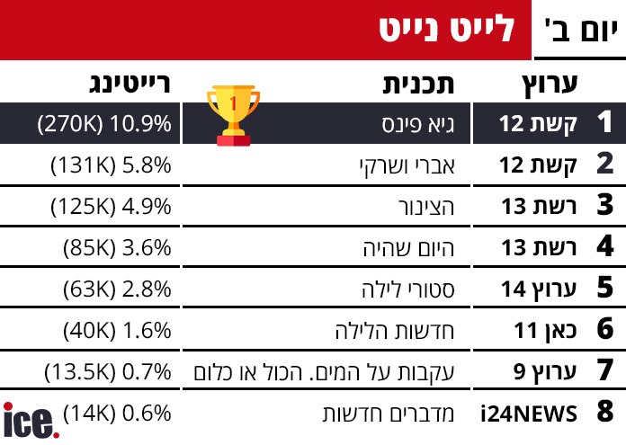 בלייט נייט. "גיא פינס" בערוץ 12 זוכה לכס הזהב עם 270 אלף צופים ורייטינג מרשים של 10.9%. במקום השני התמקמו "אברי ושרקי" בערוץ 12, שמשכו אליהם 131 אלף צופים ורייטינג של 5.8%. את המקום השלישי כבש "הצינור" בערוץ 13 עם 125 אלף צופים ו-4.9%, ואחריו "היום שהיה" בערוץ 13 עם רייטינג של 3.6% ו-85 אלף צופים. את החמישייה המובילה השלימו "סטורי לילה" בערוץ 14 עם 63 אלף צופים ו-2.8%, "חדשות הלילה" בכאן 11 עם 40 אלף צופים ו-1.6%, ו"עקבות" בערוץ 9 עם 13.5 אלף צופים ו-0.7%. "מדברים חדשות" של i24NEWS סיימה את הרשימה עם 14 אלף צופים ו-0.6%.