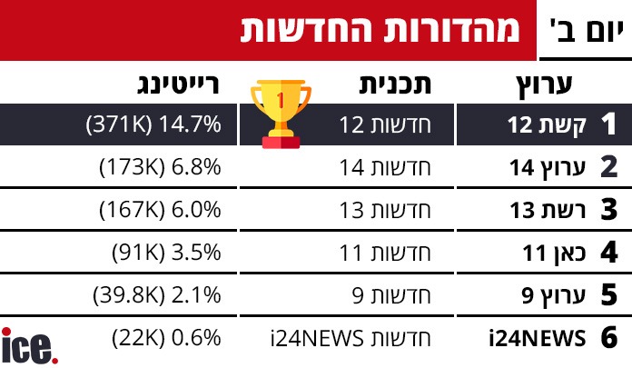 ברצועת מהדורות החדשות של הערב, "חדשות 12" שלטה באופן מוחלט עם 371 אלף צופים ורייטינג של 14.7%. "חדשות 14" הגיעה למקום השני עם 173 אלף צופים ו-6.8%, ואחריה "חדשות 13" עם 167 אלף צופים ו-6.0%. "חדשות 11" בכאן תפסה את המקום הרביעי עם 91 אלף צופים ו-3.5%, "חדשות 9" בערוץ 9 סיימה חמישית עם 39.8 אלף צופים ו-2.1%, ו"חדשות i24NEWS" סגרה את הרשימה עם 22 אלף צופים ו-0.6%.
