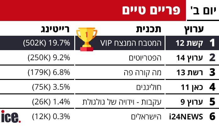 אמש (שני) בקרב על הפריים טיים בערוצים המרכזיים, קשת 12 פתחה היטב את העונה של המטבח המנצח VIP כאשר רשת 13 נחה מהאח הגדול ונשארה הרחק מאחור אפילו מאחורי הפטריוטים של ערוץ 14.