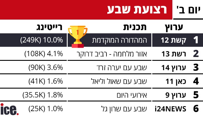 ברצועת שבע בערב, "המהדורה המוקדמת" של קשת 12 שלטה בבירור עם 249 אלף צופים ורייטינג יציב של 10.0%. "אזור מלחמה - רביב דרוקר" בערוץ 13 הגיע למקום השני עם 108 אלף צופים ו-4.1%, ואחריו "שבע עם יערה זרד" בערוץ 14 עם 90 אלף צופים ו-3.6%. במקום הרביעי התמקם "שבע עם שאול וליאל" בכאן 11 עם 41 אלף צופים ו-1.6%, וחמישי היה "אירועי היום" בערוץ 9 עם 35.5 אלף צופים ו-1.8%. את הרשימה סגר "שבע עם שרון גל" של i24NEWS עם 25 אלף צופים ו-1.0%.