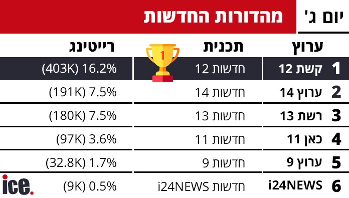 במהדורות החדשות, ״חדשות 12״ בערוץ 12 חוזרת למקום הראשון עם רייטינג של 16.2% ו-403 אלף צופים. ״חדשות 14״ בערוץ 14 מחזיקה במקום השני עם 7.5% ו-191 אלף צופים, ובמקום השלישי ״חדשות 13״ בערוץ 13 עם רייטינג זהה של 7.5% ו-180 אלף צופים. ״חדשות 11″ בכאן 11 תופסת את המקום הרביעי עם 3.6% ו-97 אלף צופים, ואילו ״חדשות 9″ בערוץ 9 מסיימת עם 1.7% ו-32.8 אלף צופים. ״חדשות i24NEWS״ סוגרת עם 0.5% ו-9 אלף צופים.