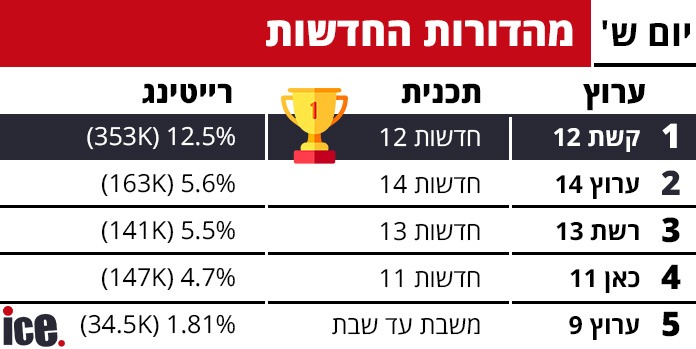 מהדורות החדשות במהדורות החדשות, "חדשות 12" בערוץ 12 מובילה עם 12.5% ו-353 אלף צופים. "חדשות 14" בערוץ 14 במקום השני עם 5.6% ו-163 אלף צופים, "חדשות 13" בערוץ 13 עם 5.5% ו-141 אלף צופים, "חדשות 11" בכאן 11 עם 4.7% ו-147 אלף צופים, ו''משבת עד שבת" בערוץ 9 עם 1.81% ו-34.5 אלף צופים.