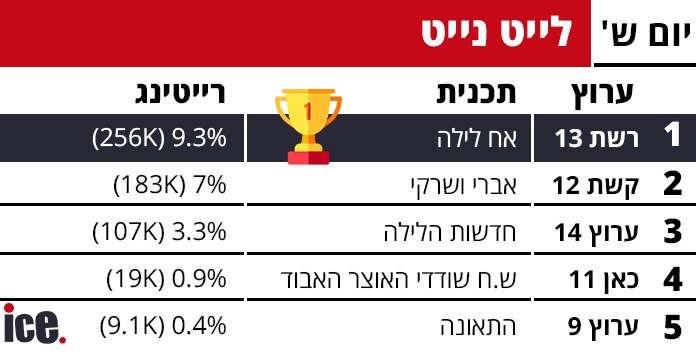 ברצועת לייט נייט, "אח לילה" בערוץ 13 מובילה עם 9.3% ו-256 אלף צופים. "אברי ושרקי" בערוץ 12 במקום השני עם 7% ו-183 אלף צופים, "חדשות הלילה" בערוץ 14 עם 3.3% ו-107 אלף צופים, "ש.ח שודדי האוצר האבוד" בכאן 11 עם 0.9% ו-19 אלף צופים, ו"התאונה" בערוץ 9 עם 0.4% ו-9.1 אלף צופים.