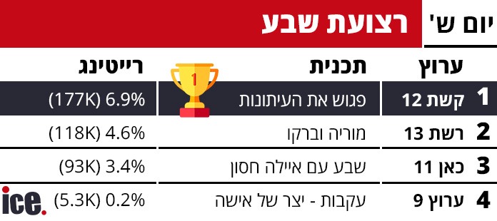 רצועת שבע ברצועת שבע, "פגוש את העיתונות" בערוץ 12 מוביל עם 6.9% ו-177 אלף צופים. "מוריה וברקו" בערוץ 13 במקום השני עם 4.6% ו-118 אלף צופים, "שבע עם איילה חסון" בכאן 11 עם 3.4% ו-93 אלף צופים, ו"עקבות" בערוץ 9 עם 0.2% ו-5.3 אלף צופים.