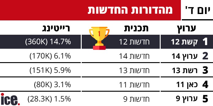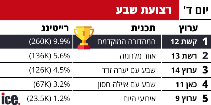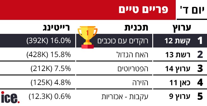 אחרי לא מעט זמן במקום השני, קשת 12 מחזירה לעצמה את הכתר ואמש (רביעי) היא מצאה את עצמה שולטת ברוב הרצועות ובמיוחד בפריים טיים על חשבון היריבה הגדולה שלה 'האח הגדול' של רשת 13.