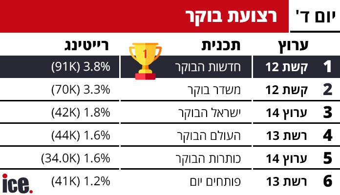 ברצועת הבוקר, חדשות הבוקר בקשת 12 הוליכו בבטחה עם 3.8% ו-91 אלף צופים, משדר בוקר המשיך עם 3.3%. בערוץ 14 היו לישראל הבוקר 1.8$ והעולם הבוקר ברשת 13 עם 1.6% בדיוק כמו כותרות הבוקר בערוץ 14 עם נתון זהה.