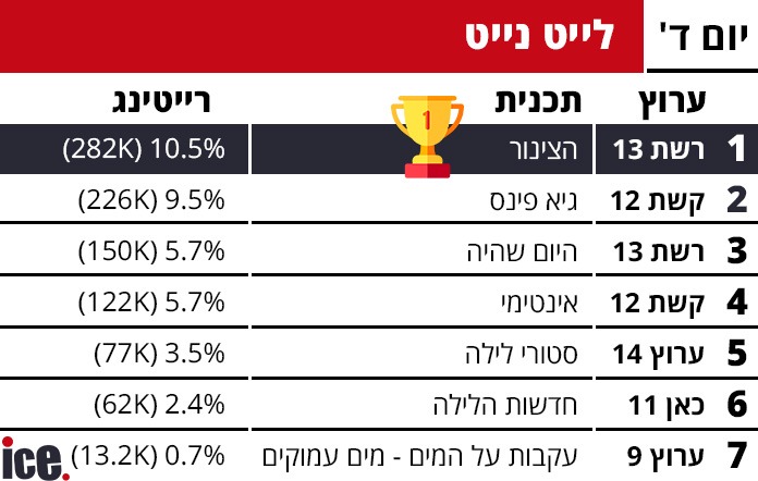 ברצועת הלייט המאוחרת "הצינור" ברשת 13 מוביל עם 10.5 ו-282 אלף צופים, אחריו "גיא פינס" בקשת 12 עם 9.5 ו-226 אלף צופים. במקום השלישי "היום שהיה" ברשת 13 עם 5.7 ו-150 אלף צופים, ובאותו רייטינג בדיוק "אינטימי" בקשת 12 עם 5.7 ו-122 אלף צופים. בתחתית הרצועה "סטורי לילה" בערוץ 14 עם 3.5 ו-77 אלף צופים, ו"חדשות הלילה" בכאן 11 עם 2.4 ו-62 אלף צופים.
