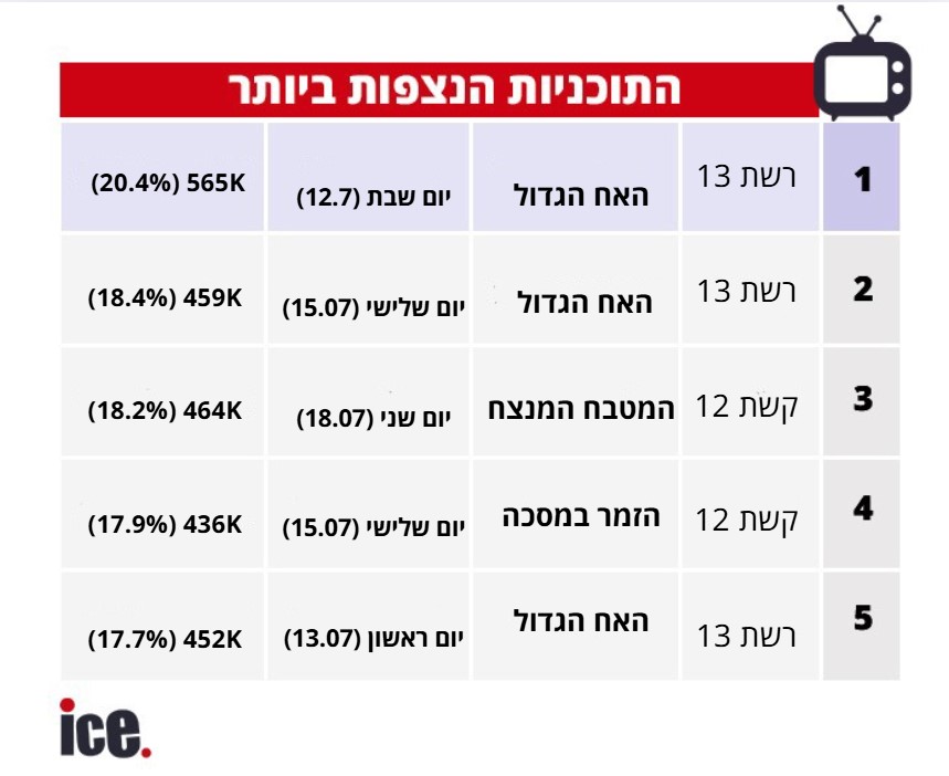רשת 13 עוקפת את קשת 12 ברצועת הפריים טיים: תוכנית הריאליטי "האח הגדול" השיגה 20.4% רייטינג ו-565 אלף צופים. קשת 12 ניצבת במקום השלישי בזכות התוכנית "המטבח המנצח" עם 18.2% ו-464 אלף צופים