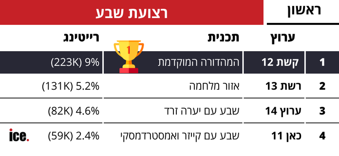 במקום השלישי ברצועת הפריים טיים ניצבים "הפטריוטים" של ערוץ 14 עם 6.9% ו-208 אלף צופים. סוגרת את הרביעייה "המרדף" של כאן 11 עם הילה קורח עם 4% ו-106 אלף צופים.