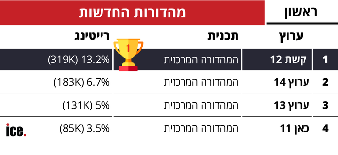 בגזרת החדשות, המהדורה של קשת 12 עם יונית לוי ממשיכה להוביל בגאון את הטבלה, עם 13.2% ו-319 אלף צופים. במקום ה-2 המהדורה של ערוץ 14 עם מגי טביבי שגרפה 6.7% ו-183 אלף צופים. במקום השלישי חדשות 13 עם דוריה למפל שלקחה 5% ו-131 אלף צופים. המהדורה של כאן 11 סוגרת את הרשימה עם 3.5% ו-85 אלף צופים.