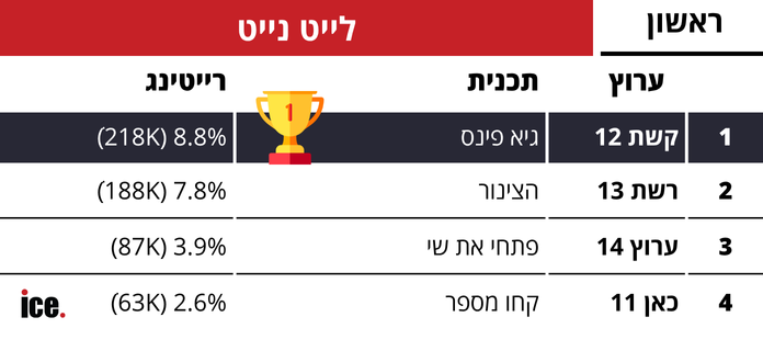 ברצועת הלייט נייט גיא פינס וקשת 12 ניצבים במקום הראשון עם 8.8% ו-218 אלף צופים, כש"הצינור" של רשת 13 עם 7.8% ו-188 אלף צופים במקום ה-2. אחריהם "פתחי את שי" (3.9%, 87 אלף) במקום ה-3, ו"קחו מספר" של כאן 11 (2.6%, 63 אלף) במקום הרביעי.