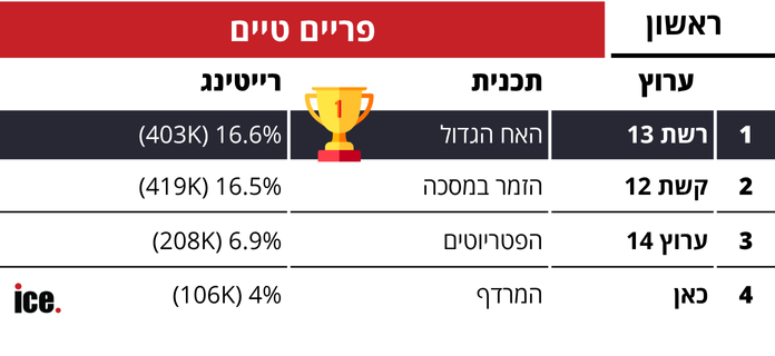 התחרות הצמודה נמשכת: "הזמר במסכה" ו"האח הגדול" שוב בפוטו פיניש, יונית לוי וקשת 12 ממשיכים להוביל - וכמה קיבלו הפטריוטים?
