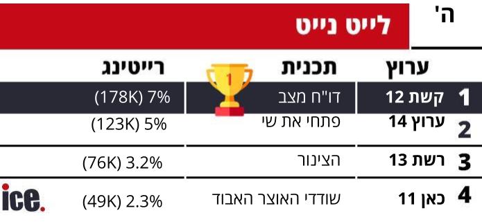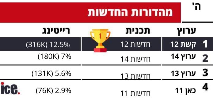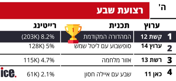 רייטינג: קשת ממשיכה להוביל, הישג לערוץ 14
