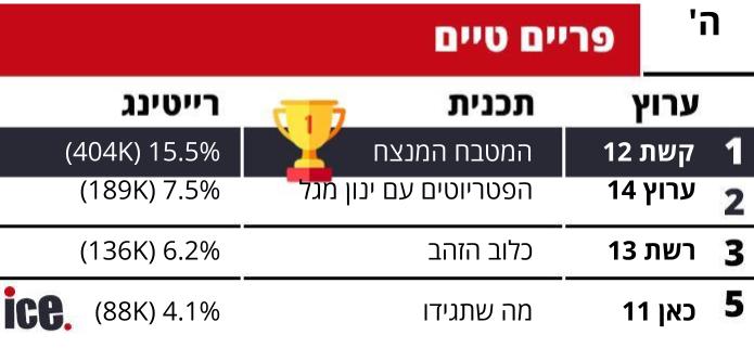 נתוני הרייטינג של יום חמישי חושפים שקשת 12 הערוץ הנצפה ביותר בישראל ברוב שעות השידור. זאת כאשר המטבח המנצח הביא ל-15.5% רייטינג ששווים ל-404 אלף צופים. ערוץ 14 רושם הישג ועוקף את רשת 13.