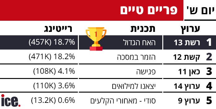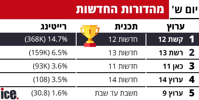 קרב צמוד בין רשת לקשת ברצועת הפריים טיים, אבל ההדחה מהבית המפורסם במדינה סיקרנה את הצופים יותר מהמתרחש בקשת 12