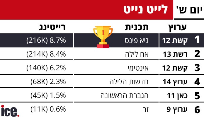 בשעות הלילה המאוחרות, גיא פינס בקשת הוכיח שוב את עוצמתו עם רייטינג של 8.7% ו-216 אלף צופים. רשת נשארה במרחק נשימה עם "אח לילה" שקלע לרייטינג של 8.4% ו-214 אלף צופים - תחרות צמודה ביותר בין שתי התכניות המובילות ברצועה.
