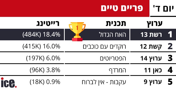 רצועת הפרים טיים הציגה את הקרב הגדול של הערב בין שתי תכניות דגל. "האח הגדול" ברשת 13 זכה לניצחון עם 18.4% רייטינג מרשים ויותר מ-484,000 צופים. "רוקדים עם כוכבים" בערוץ 12 השיג את המקום השני עם 16.0% רייטינג ו-415,000 צופים.