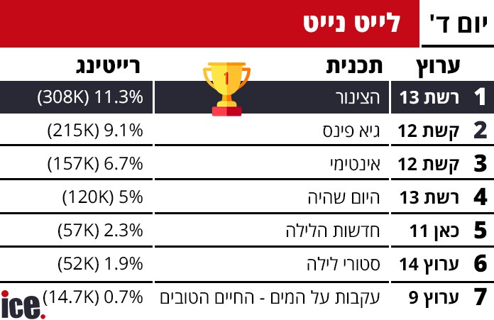 בלייט נייט "הצינור" ברשת 13 זכתה למקום הראשון המובהק עם 11.3% רייטינג ויותר מ-308,000 צופים. ערוץ 12 השיג את המקום השני עם "גיא פינס" שצפו בה 215,000 צופים ורשמה 9.1% רייטינג. אל המקום השלישי הגיעה קשת 12 עם "אינטימי" שהשיגה 6.7% רייטינג עם 157,000 צופים. רשת 13 חזרה למקום הרביעי עם "היום שהיה" - 5% רייטינג ו-120,000 צופים. כאן 11 השיגה את המקום החמישי עם "חדשות הלילה" - 2.3% רייטינג ו-57,000 צופים. ערוץ 14 שישי עם "סטורי לילה" שהשיגה 1.9% רייטינג עם 52,000 צופים, ואת הרצועה סגר ערוץ 9 עם "עקבות" שרשמה 0.7% בלבד.