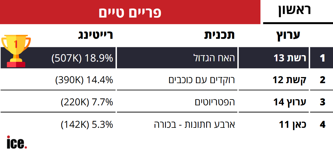 רשת 13 חוגגת הישג מרשים ברצועת הפריים טיים עם "האח הגדול" שהגיע לרייטינג של 18.9 עם 507 אלף צופים, מה שהפך אותו לתוכנית המובילה בכל הטלוויזיה הישראלית אמש. בפער ניכר מאחוריו הגיע "רוקדים עם כוכבים - קרב המנטורים" בקשת 12 עם 14.4 רייטינג ו-390 אלף צופים.