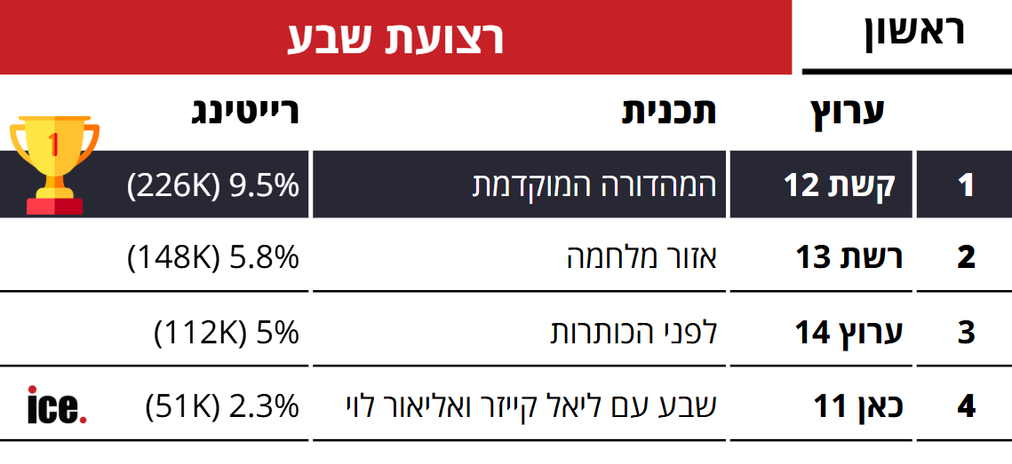 ברצועת השעה 19:00, המהדורה המוקדמת של גדעון אוקו בקשת 12 זכתה לרייטינג מרשים של 9.5 עם 226 אלף צופים. "אזור מלחמה" עם רביב דרוקר ברשת 13 הגיע למקום השני עם 5.8 רייטינג ו-148 אלף צופים, ואחריו מגי טביבי ב"לפני הכותרות" בערוץ 14 עם 5.0 רייטינג ו-112 אלף צופים. כאן 11 עם "שבע" של ליאל קייזר ואליאור לוי סגרה עם 2.3 רייטינג ו-51 אלף צופים.