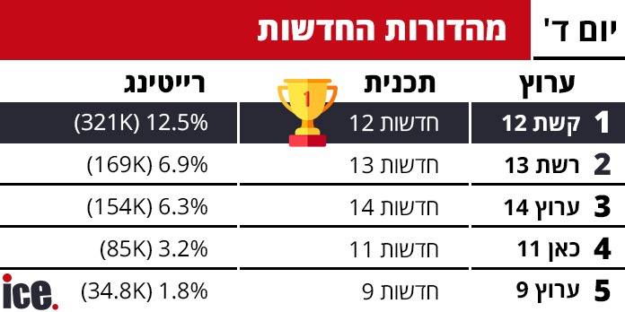 האם מדובר עבור חדשות 13 בתחילתו של קאמבק לעבר התייצבות במקום השני במאבק מול קשת 12? או נפילה רגעית מול העלייה החזקה של ערוץ 14 בחודשים האחרונים? הנתונים של הימים הבאים יכריעו: מיהו הערוץ שיקבל את התנופה והמומנטום.